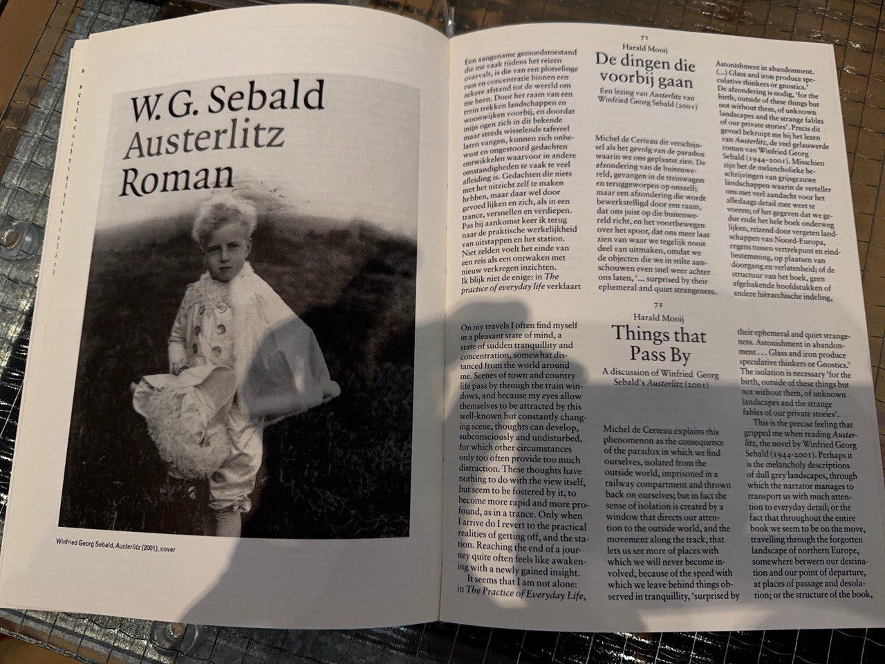 Like the main character of Austerlitz, Jacques Austerlitz — who begins to hear echoes of his past in the resonances throughout the world — you too, traveling with this book in your hands, start rhyming yourself, your space with the book and, at the same time, with reality. You crack open pages you would never have touched in your life.